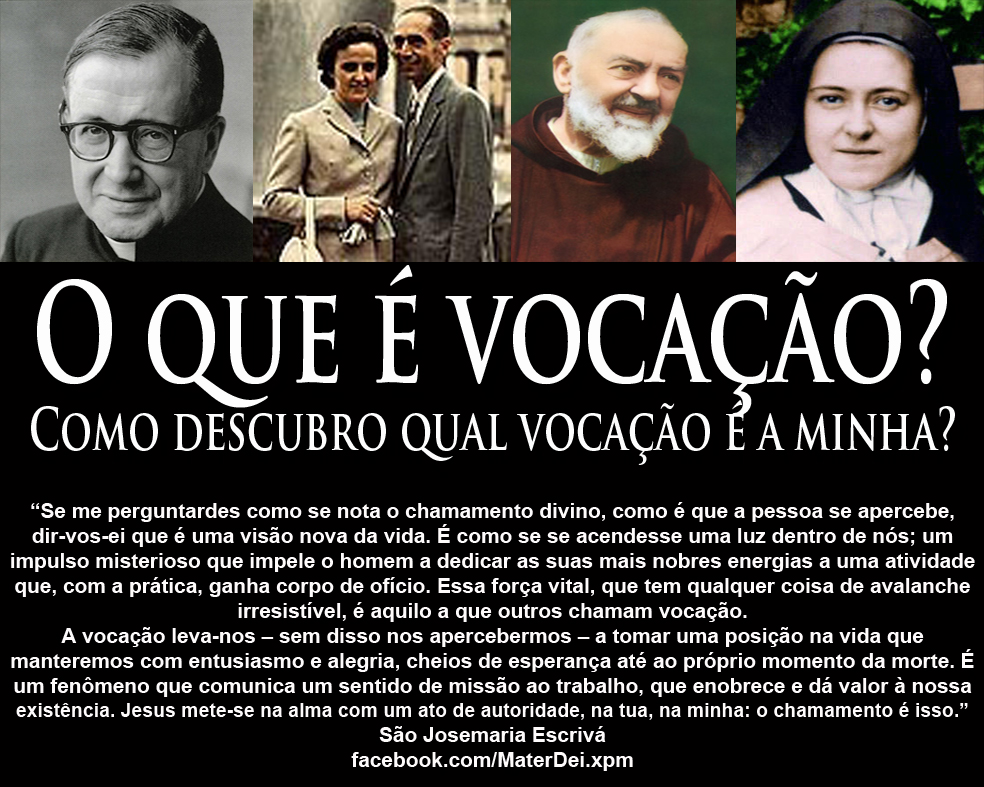 Deus nos chama à santidade. A todos nós e a cada um. Essa é a nossa vocação comum e fundamental, ou seja, todos devemos ser santos. Para que a santidade se efetive realmente em nossa vida, Deus tem um chamado especial para seus filhos e filhas. Esse chamado ou vocação (do latim vocare = chamar) é feito em vista da realização de cada um de nós. Pede, por isso, uma resposta livre e consciente. A concretização do chamado e da resposta realiza-se na e para a comunidade. É nela e só nela que toda vocação se concretiza e é para a comunidade, a serviço dela, que a vocação tem sentido.